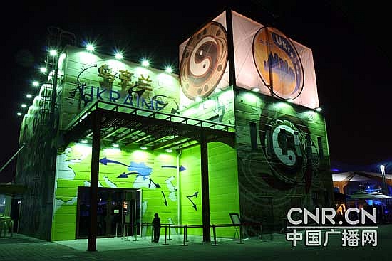 乌克兰馆夜景呈现闪亮绿色,外墙上还有太极图案。(中广网记者涂傲摄)