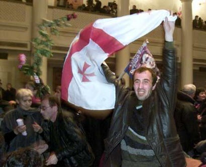 11月22日,格鲁吉亚反对派人士冲入位于首都第比利斯的议会大厦,要求总统谢瓦尔德纳泽辞职。谢瓦尔德纳泽宣布国家进入紧急状态,反对派女领导人布尔扎纳泽宣布自己替代谢瓦尔德纳泽履行总统职能。图为反对派人士在议会大厦内挥舞国旗。