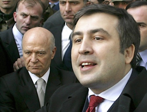 这是2004年3月18日,格鲁吉亚总统萨卡什维利(右)与格鲁吉亚阿扎尔自治共和国领导人阿巴希泽(左)在阿扎尔自治共和国首府巴统在一起的资料照片。阿巴希泽于5月6日凌晨辞职并乘飞机离开巴统前往莫斯科。新华社发