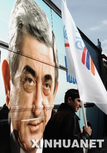 2月17日,在亚美尼亚首都埃里温,一名青年手持旗帜从总统候选人、现任总理谢尔日·萨尔基相的画像前经过。亚美尼亚总统选举定于2月19日举行,候选人包括萨尔基相等9人。 新华社记者刘洋摄