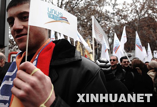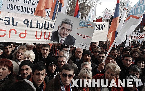 2月17日,亚美尼亚总统候选人、现任总理谢尔日·萨尔基相的支持者在首都埃里温举行集会。亚美尼亚总统选举定于2月19日举行,候选人包括萨尔基相等9人。 新华社记者刘洋摄