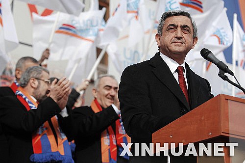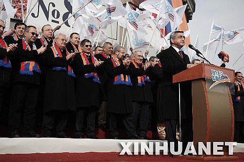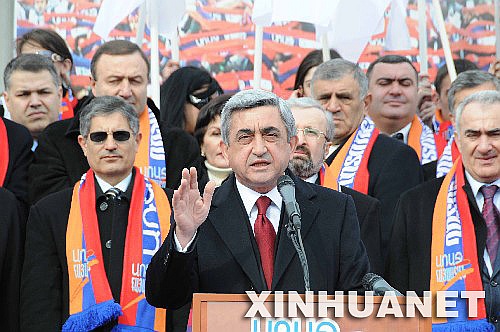 2月17日,亚美尼亚总统候选人、现任总理萨尔基相(前)在亚美尼亚首都埃里温的一个竞选集会上发表演说。亚美尼亚总统选举定于2月19日举行。 新华社记者刘洋摄