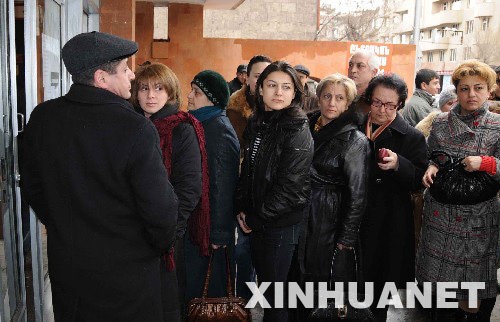 2月19日,在亚美尼亚首都埃里温,人们排队等待进入一个投票站内参加投票。亚美尼亚总统选举投票于当地时间19日8时(北京时间12时)正式开始。亚全国41个选区共设1923个投票站,全国有230万登记选民,投票过程将持续12小时,从9名候选人中选出新的总统。 新华社记者魏良磊摄