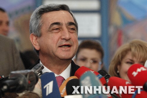 2月19日,亚美尼亚热门总统候选人、现任总理谢尔日·萨尔基相在首都埃里温市的一处投票站投票后接受记者采访。亚美尼亚总统选举投票于当地时间19日8时(北京时间12时)正式开始。亚全国41个选区共设1923个投票站,全国有230万登记选民,投票过程将持续12小时,从9名候选人中选出新的总统。 新华社记者刘洋摄