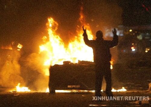 2008年3月2日,在亚美尼亚首都埃里温市,一名反对派示威者站在燃烧的警车前。亚美尼亚总统科恰良1日晚宣布首都埃里温从当天开始进入紧急状态,以防止反对派的示威活动造成社会动荡。1日早晨,警方强行驱散了自20日以来一直聚集在市中心自由广场的反对派示威者,驱逐行动造成包括6名警察在内的30多人受伤。 新华社/路透