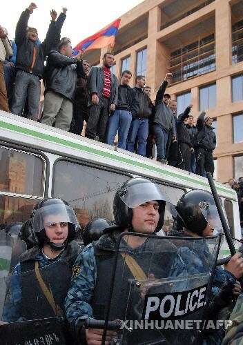 2008年3月1日,在亚美尼亚首都埃里温市,防暴警察站在反对派示威者前。亚美尼亚总统科恰良当日晚宣布首都埃里温从当天开始进入紧急状态,以防止反对派的示威活动造成社会动荡。当日早晨,亚警方强行驱散了自20日以来一直聚集在市中心自由广场的反对派示威者,驱逐行动造成包括6名警察在内的30多人受伤。 新华社/法新