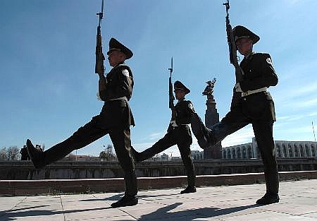 3月29日,在吉尔吉斯斯坦首都比什凯克市中心阿拉套中央广场上,吉尔吉斯斯坦国旗护卫队在进行换岗仪式。