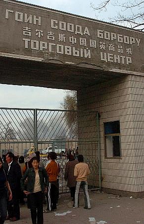 3月25日,人群在吉尔吉斯斯坦首都比什凯克的中国国英商品城前围观。24日晚,该商场遭到抢劫,全部商品被抢毁一空。