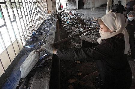 4月1日,在吉尔吉斯斯坦首都比什凯克,一名清洁工人在日前遭抢劫的国英商贸城内清理废弃物。中国商品集中的国英商贸城3月24日夜遭歹徒劫掠后被付之一炬,许多中国商户蒙受巨大损失。目前,国英商贸城的废墟清理工作已经开始,并等待重新修缮。