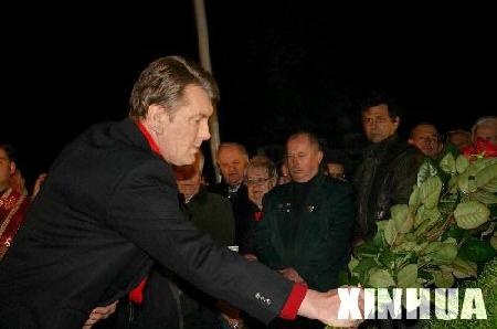 4月26日凌晨,乌克兰总统尤先科在基辅切尔诺贝利抢险英雄纪念碑前敬献鲜花。
