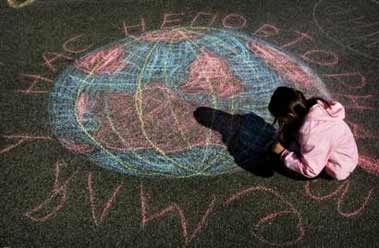 中新网4月24日电 据路透社报道,4月26日是切尔诺贝利核泄漏事故20周年纪念日,乌克兰和白俄罗斯都将举行各种形式的纪念活动,以此悼念在那次严重事故中遇难的人们。图为一个长长的阴影投射在乌克兰儿童的地球粉笔画上。(春风)