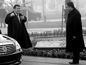 逝世总统尼亚佐夫(左)与现代理总统职务的前副总理古尔班古雷·别尔德穆罕默多夫。资料图片据中新社22日电土库曼斯坦总统尼亚佐夫21日去世后,引发了一场权力争斗。总统身边的人违宪任命副总理为代总统,本应接任代总统的议长在拥有司法豁免权的情况下受到刑事指控,现已被关押。全国军警进入高度戒备状态,边防部门紧急加强国界防护, 各派势力已为国家最高权力展开争夺。