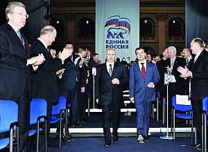 俄罗斯媒体说,普京和梅德韦杰夫在俄政坛并肩作战多年,私交甚厚。两人17日肩并肩走入会场,接受统一俄罗斯党代表热烈的掌声。