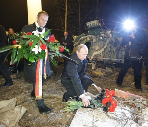 两国总理在图-154坠毁的一个坑里放下了鲜花。图斯克手持鲜花,单膝下跪。献完花后,两国政府首脑相互拥抱。