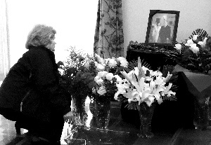 波兰驻华大使馆公使衔参赞鲍莱克负责引领来者前往临时悼念厅。厅内的玻璃器皿盛着各种颜色的鲜花,它们簇拥着卡钦斯基夫妇的相片。相片中的卡钦斯基,身着深色的西服,系着一条泛着光泽的波尔多红领带;他的夫人玛利娅穿的是淡金色套装。