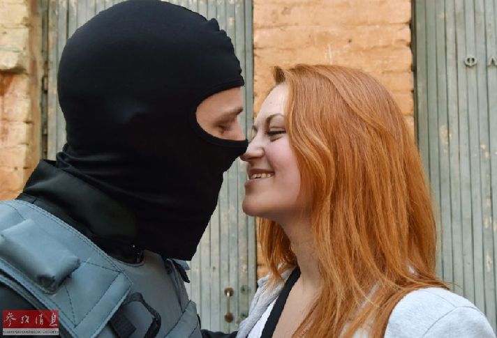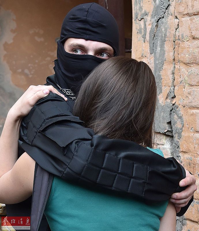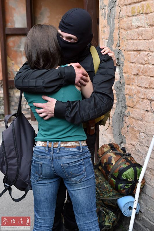 6月3日,在乌克兰基辅,40名乌克兰社会国家大会党以及极右党派成员宣誓加入志愿部队,并与乌克兰军队一同参加反恐训练。图为志愿兵与女友“道别”。