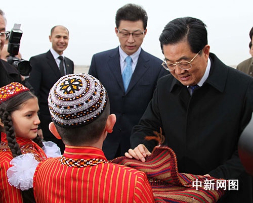 土库曼斯坦政府官员和当地华侨华人赶到机场迎接。两名土库曼儿童分别向胡锦涛献花和面包,请胡锦涛掰下两小块面包品尝。