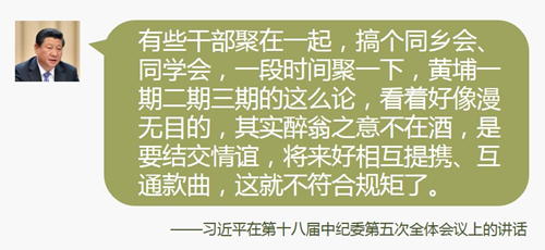 ·有些干部聚在一起,搞个同乡会、同学会,一段时间聚一下,黄埔一期二期三期的这么论,看着好像漫无目的,其实醉翁之意不在酒,是要结交情谊,将来好相互提携、互通款曲,这就不符合规矩了。这种聚会最好不要搞,这种饭最好不要吃。有的人只要是他工作过的地方,都利用手中的权力“正正规规”地搞团团伙伙,全要搞成他自己的领地,到处插手人事安排,关照自己小圈子里的人,结果他们就成了一根绳上的蚂蚱。