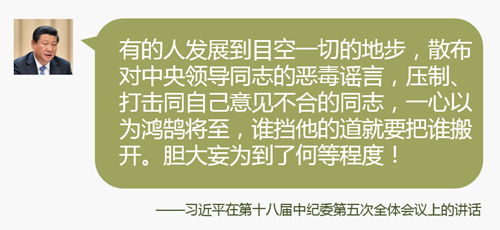 ·在所有党的纪律和规矩中,第一位的是政治纪律和政治规矩。从近年来查处的高级干部严重违纪违法案件特别是周永康、薄熙来、徐才厚、令计划、苏荣等案件看,破坏党的政治纪律和政治规矩问题非常严重,务必引起重视。这些人权力越大、位置越重要,越不拿党的政治纪律和政治规矩当回事儿,甚至到了肆无忌惮、胆大包天的地步!有的政治野心膨胀,为了一己私利或者小团体的利益,背着党组织搞政治阴谋活动,搞破坏分裂党的政治勾当!