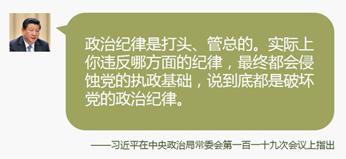 ·违反政治纪律,破坏政治规矩,巡视也发现了这方面的问题,中央强调政治纪律并不是无的放矢。政治敏锐性是对意识形态领域最基本的要求,决不能在这方面犯错误。对顶风违反政治纪律、政治规矩的问题,必须严厉查处。