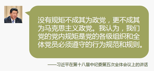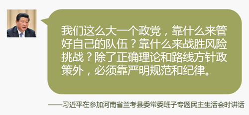 ·我们这么大一个政党,靠什么来管好自己的队伍?靠什么来战胜风险挑战?除了正确理论和路线方针政策外,必须靠严明规范和纪律。我们提出那么多要求,要多管齐下、标本兼治来落实,光靠觉悟不够,必须有刚性约束、强制推动,这就是纪律。