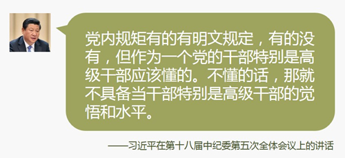 ·党内规矩有的有明文规定,有的没有,但作为一个党的干部特别是高级干部应该懂的。不懂的话,那就不具备当干部特别是高级干部的觉悟和水平。没有明文规定一定要报的事项,报还是不报,关键看党的观念强不强、党性强不强。领导干部违纪往往是从破坏规矩开始的。规矩不能立起来、严起来,很多问题就会慢慢产生出来。很多事实都证明了这一点。讲规矩是对党员、干部党性的重要考验,是对党员、干部对党忠诚度的重要检验。