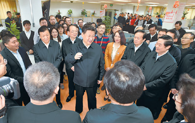19日上午,习近平首先来到人民日报社调研。编辑楼内,一块块展板、一幅幅照片展示了党中央对人民日报的关怀,反映了人民日报社走过的不平凡历程。习近平一边观看,一边听汇报,他充分肯定人民日报创刊68年来为党和人民事业作出的重要贡献。在总编室夜班平台,习近平看编辑排版,同大家亲切交流,勉励他们不忘初衷、坚定信念,把报纸办得更好,为全国人民提供更多更好的精神食粮。习近平走进新媒体中心,在大屏幕前听取微博、微信、客户端工作介绍,并在一台电脑前坐下,通过新媒体平台发送语音信息,向全国人民致以元宵节的问候和祝福。