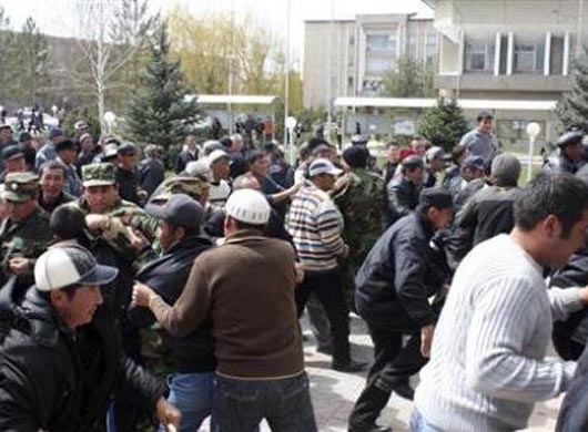 吉尔吉斯斯坦示反对派威者冲击政府总部与防暴警察发生冲突,要求总统巴基耶夫辞职。图片来源:美联社
