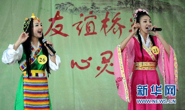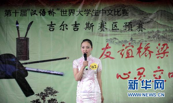 5月17日,在吉尔吉斯斯坦首都比什凯克,选手在中文比赛中表演。当天,吉尔吉斯斯坦举办第十届“汉语桥”世界大学生中文比赛吉尔吉斯赛区预赛,来自19个高校的25名选手参加了角逐。 新华社记者沙达提摄