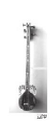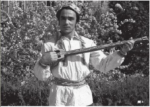 维吾尔的热瓦甫(Rewap),清代被列入宫廷的回部乐。《律吕正义后编》(公元1746年成书)收录称喇巴卜。毛拉·艾斯木吐拉穆吉孜《乐师史》中记载,热瓦普起源于南疆喀什。民间流传的喀什热瓦普,全长130厘米。音箱呈半球形,用整块桑木挖制,面部蒙羊皮或驴皮。琴头的弦槽部位向后呈直角弯曲。琴杆上缠有二十八个丝弦品位。琴杆与音箱连接处两侧各设一弯角。琴杆、音箱上镶有驼骨、贝壳等装饰。张一条主奏弦和四至六条共鸣弦,均用钢丝弦。主奏弦定弦c1,四条共鸣弦定弦e、A、d、g,六条共鸣弦定弦#f.B、e、A、d、g或B、e、E、A、d、g。音域约两个八度(图4)。